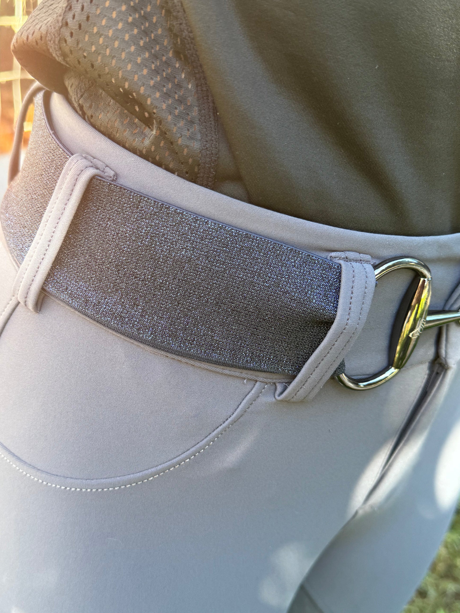 2” equestrian gold belt buckle. Stretches for comfort. One size fits all 24” to 48” waist.
