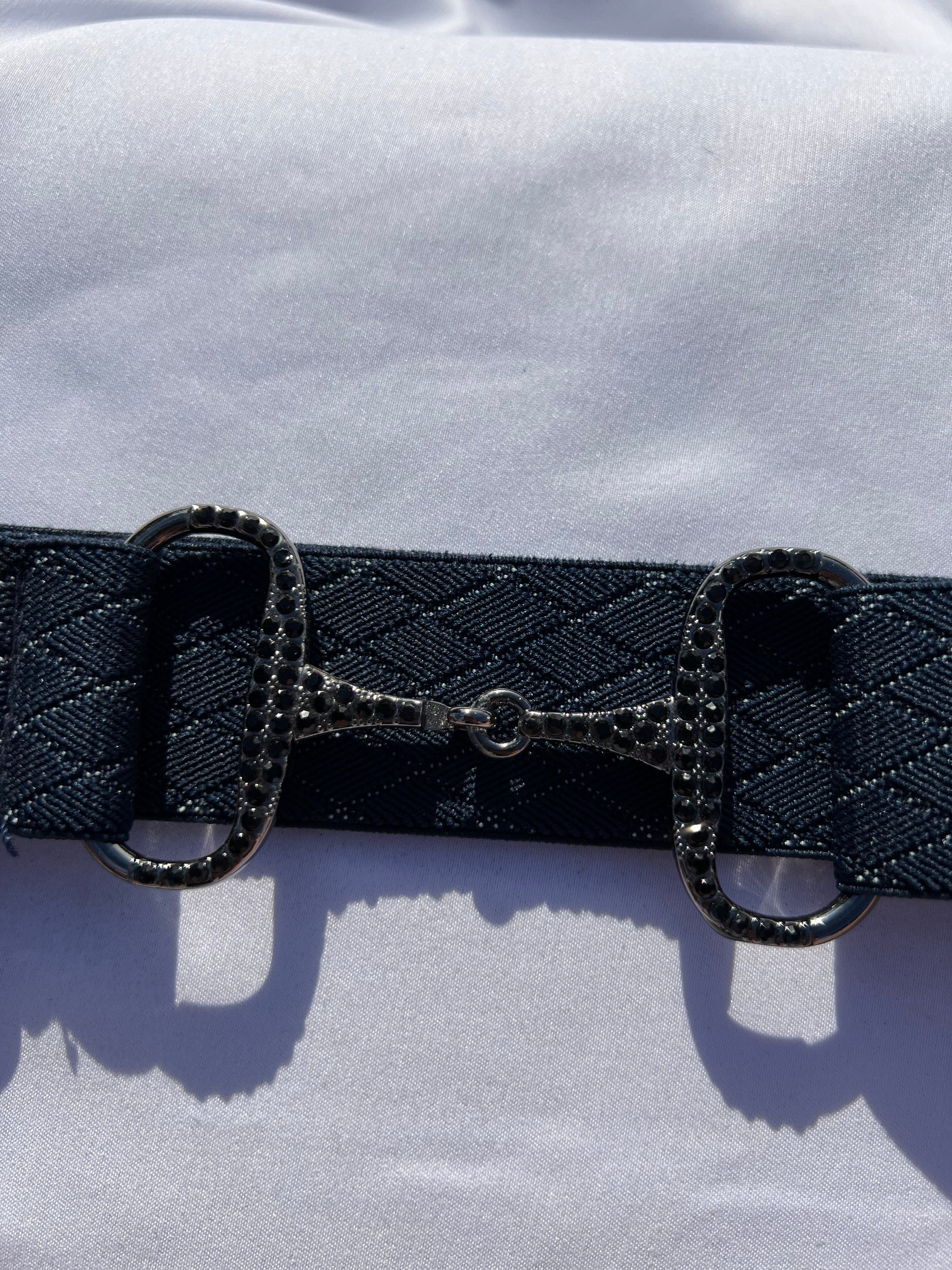Black Diamond 1.5” equestrian snaffle belt buckle in Black gun metal with black rhinestone crystals. Stretches for comfort. One size fits all 24” to 40” waist. Flattering with both breeches and jeans