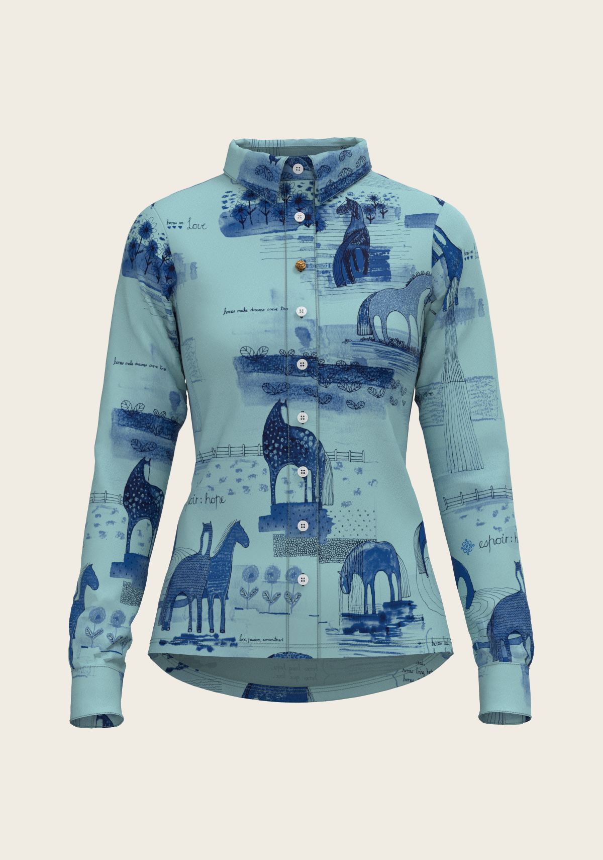 A new collection of Espoir shirts made from a technical, breathable, structured sports fabric that is UV resistant. The everyday button shirts have a center panel of buttons with one small custom gold Espoir button on the front and one on each cuff. The fabric patterns are hand illustrated. A slimming fit for an easy wearing stable to street style shirt.