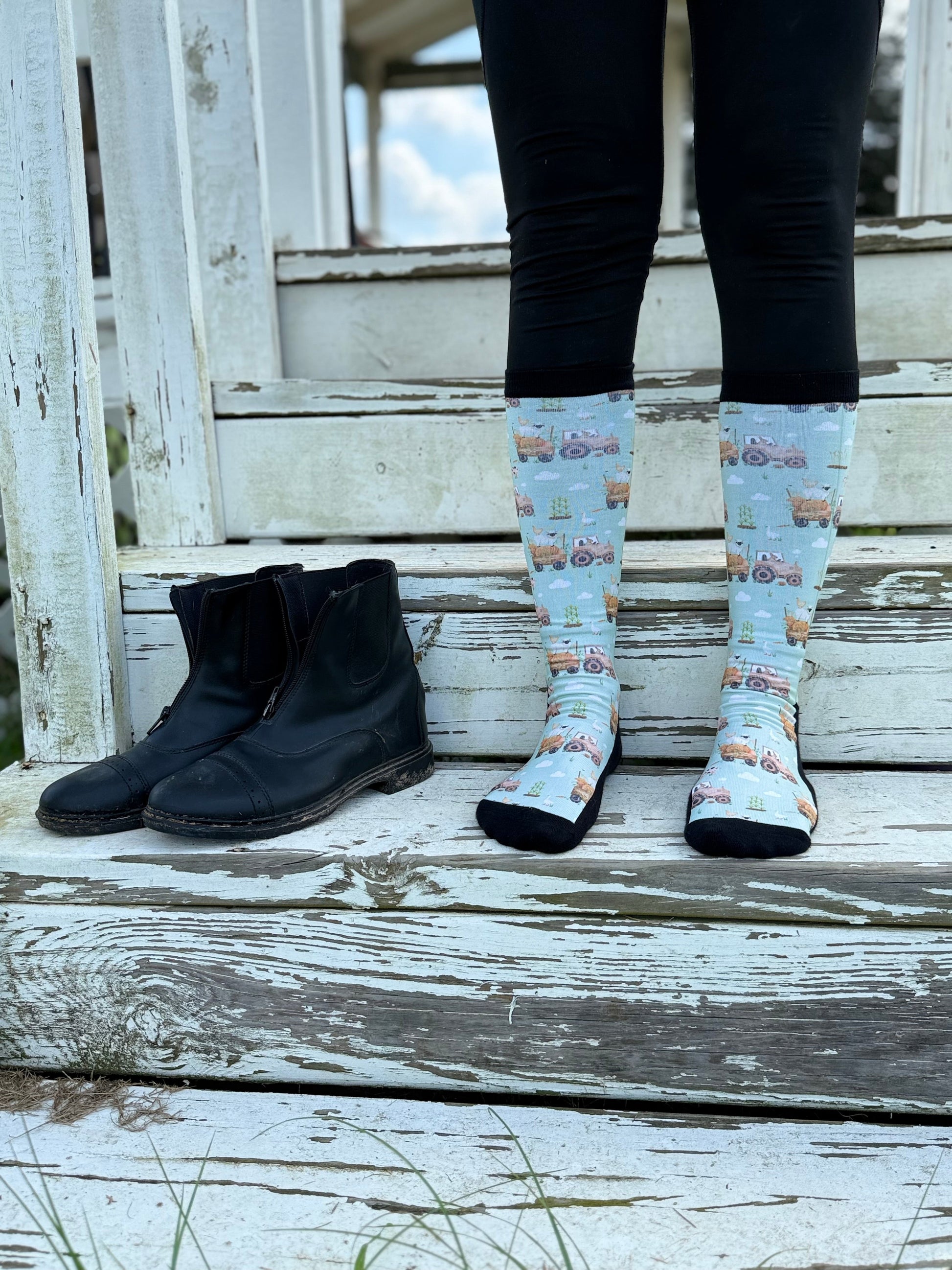 All aboard the cutest countryside ride! Hayfield Friends features a fun farm scene with fluffy sheep, playful pigs, and even a talented bunny driving tractor for his crew. This sock is perfect for animal lovers, tractor fans, and anyone who appreciates a little rural charm in their day. Available in petite sizing (2-3" shorter than our regular sock - great for petite ladies and youth).