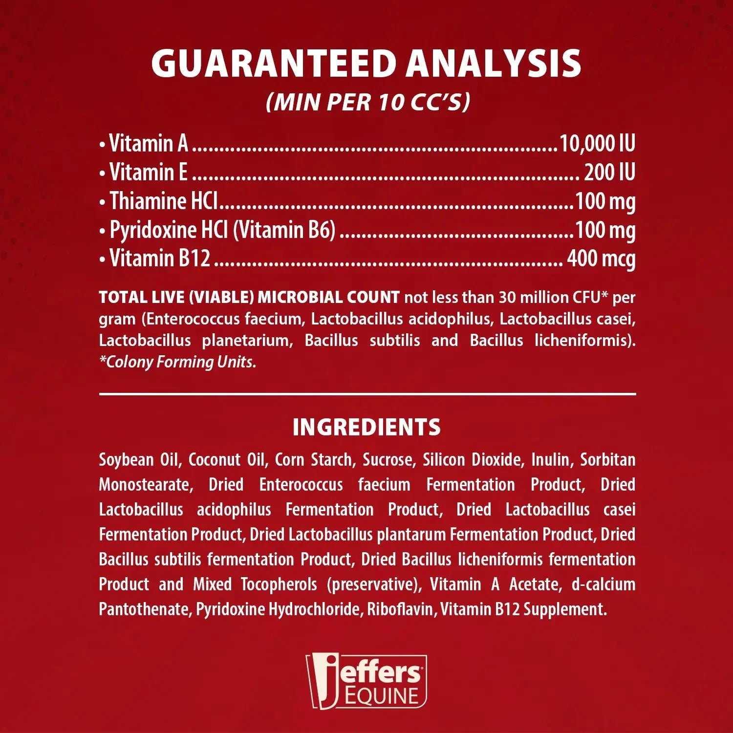 Jeffers Equine Probiotic Oral Gel provides essential digestive and immune support for horses during times of stress, transition, or recovery. Formulated with stabilized direct-fed microbials, prebiotic inulin, and key vitamins, this oral gel helps maintain a healthy gut and natural appetite. Each gram contains a minimum of 30 million CFU from beneficial strains such as Enterococcus faecium, Lactobacillus acidophilus, and Bacillus subtilis. Ideal for foals and adult horses, it's an excellent addition to deworming protocols, post-antibiotic care, and times of travel or dietary change.
