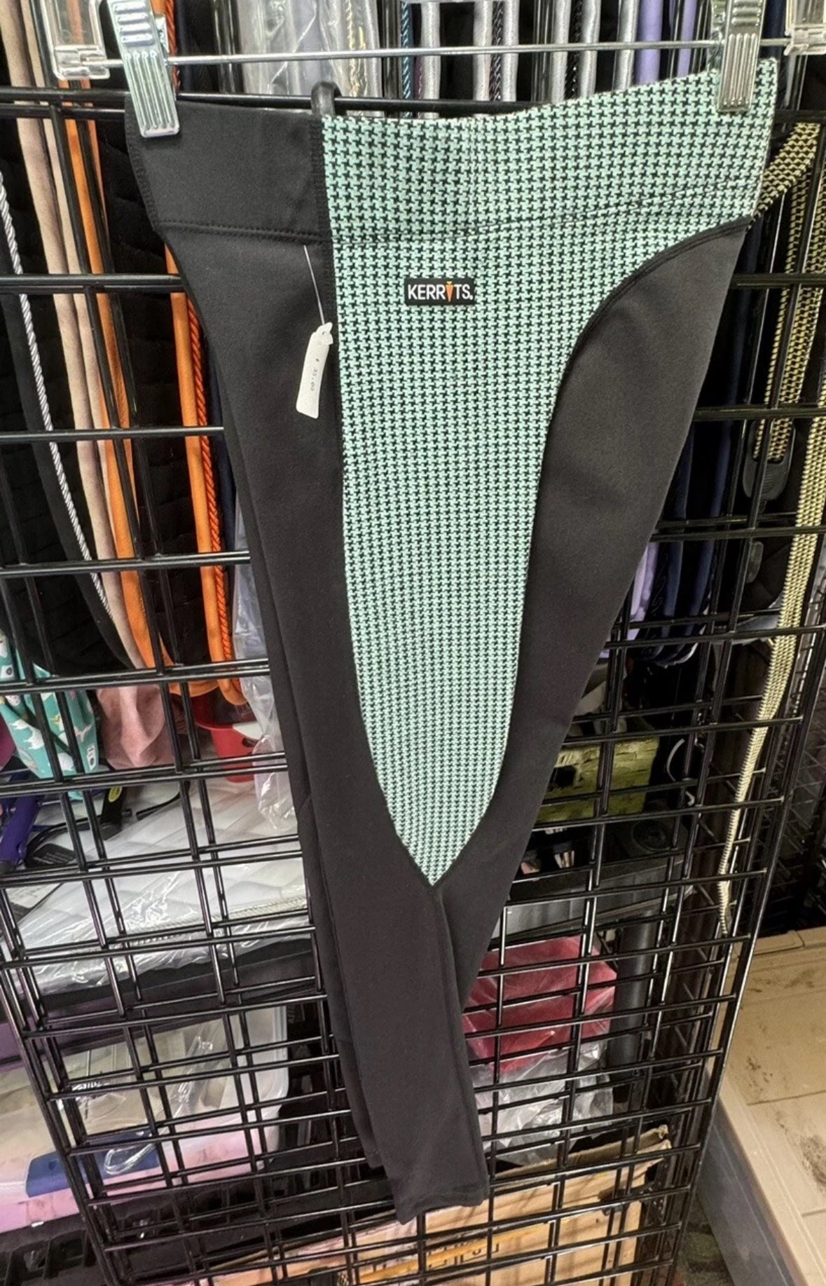This is a pair of Kerrits Flow rise knee patch performance tight in green houndstooth and black size small. List price $79.95. A smooth, seamless ride is always best; cantering, loping, or simply meandering through the forest. These tights deliver it year-round. Lightweight and breathable, we put no stitching or seams between horse and rider, only in just the right places to enhance the performance and fit of these super comfy, perennially popular tights. Plus, these durable tights hold their shape ride after ride.