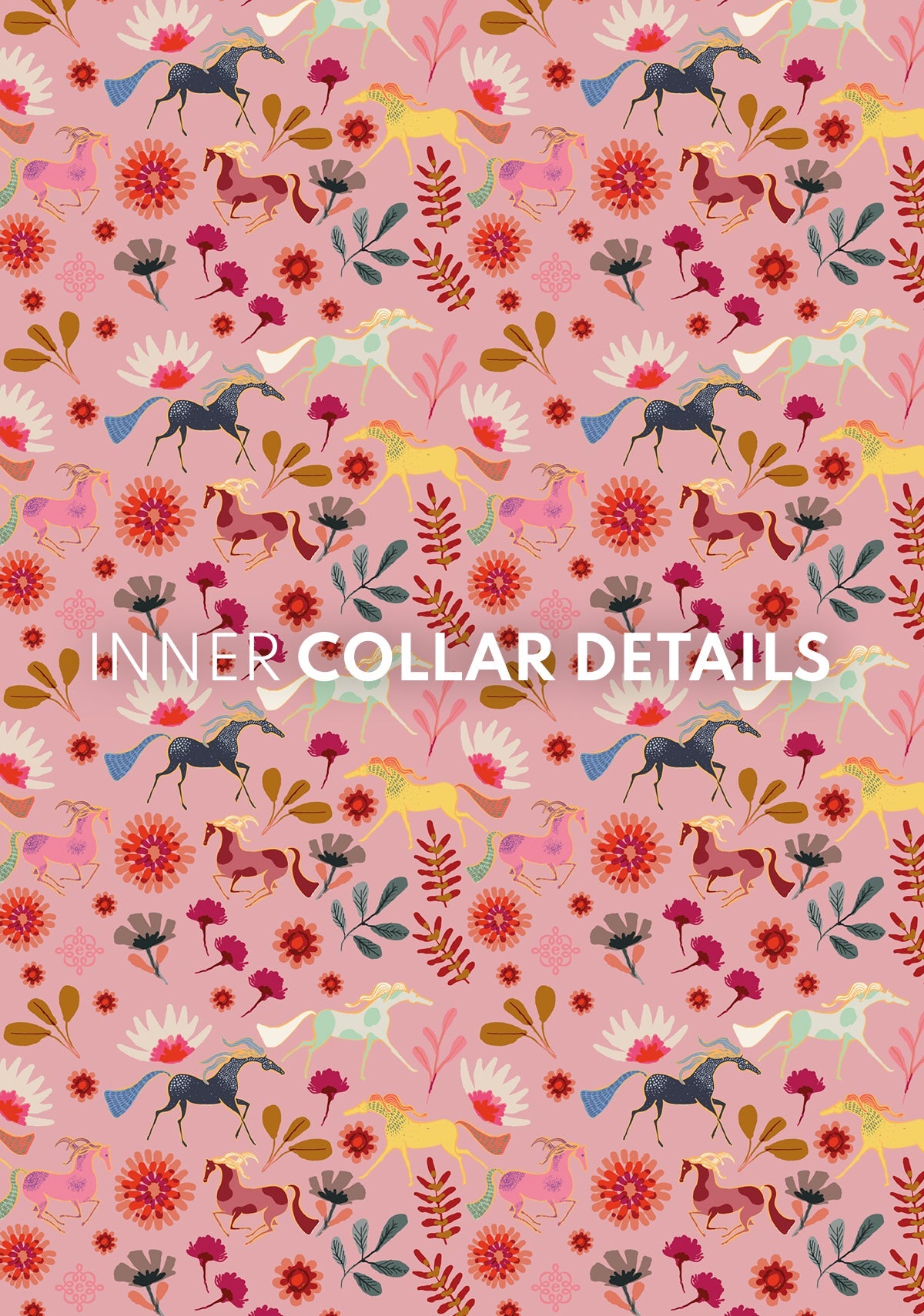 A formal looking show shirt made from luxurious technical fabrics. A hidden quarter zip is neatly constructed by a printed inner detailed fabric. On the front chest there is a Swarovski logo detail. Two hidden stud buttons easily closes the top collar. The inner collar and cuffs have hidden printed details. Cuffs have the custom Espoir button and the back of the collar, our signature Espoir ribbon detail. These show shirts are available in long and short sleeve.
